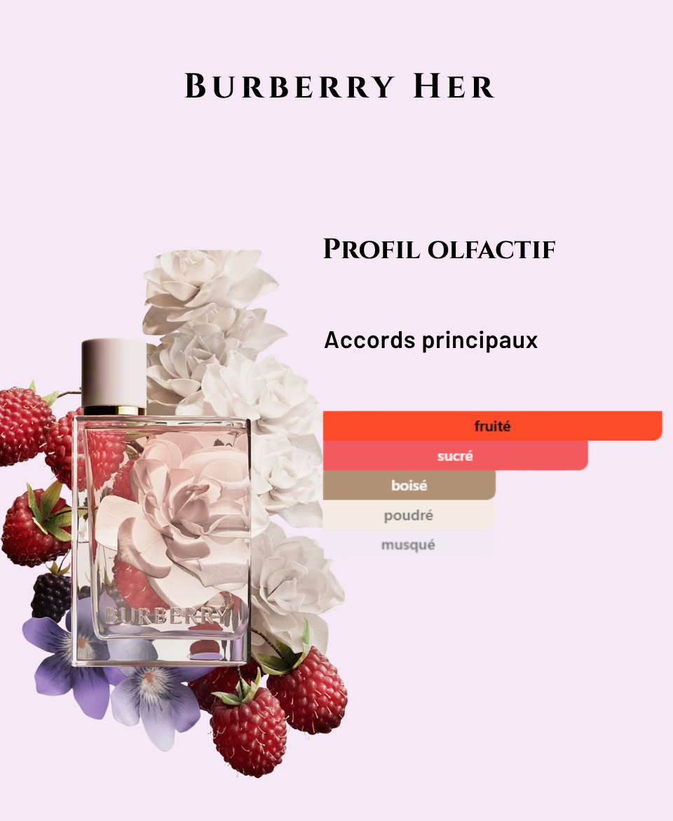 Élégante & directe Burberry Her, c’est l’alliance parfaite du fruité et du floral. Des notes de fruits rouges juteux s’ouvrent sur un cœur de rose et de jasmin, avant de se fondre dans un musc soyeux et un bois ambré. Une fragrance fraîche le jour, envoûtante le soir. Douce mais caractérielle — exactement comme elle.